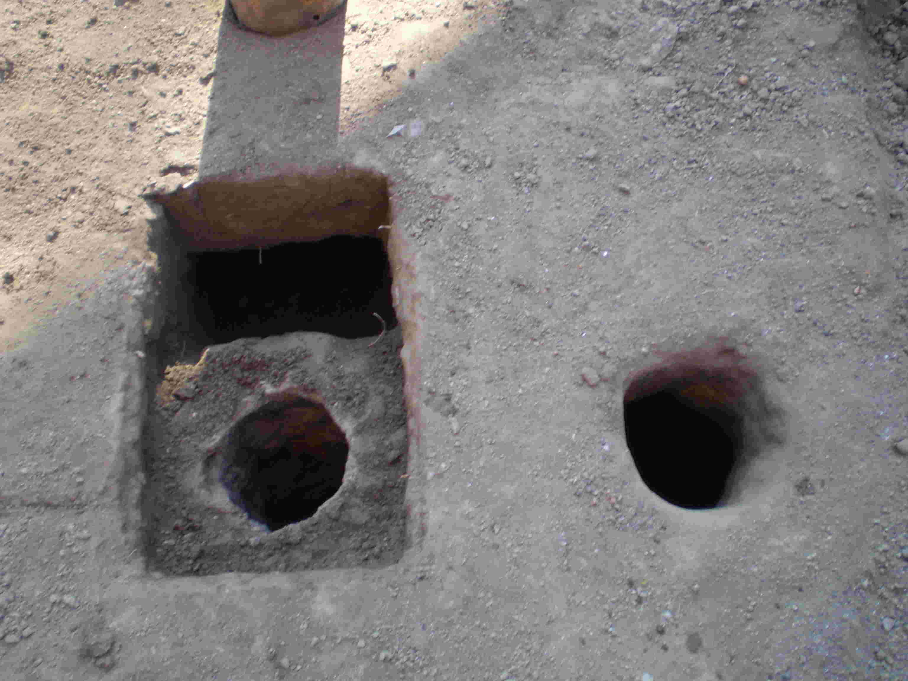 I then dug a couple of 3” holes about 1foot deep as shown below. Their centers are spaced about 8” apart, but none of the dimensions are critical; remember that we are trying to adapt to what we have, not to what we'd like to have.
