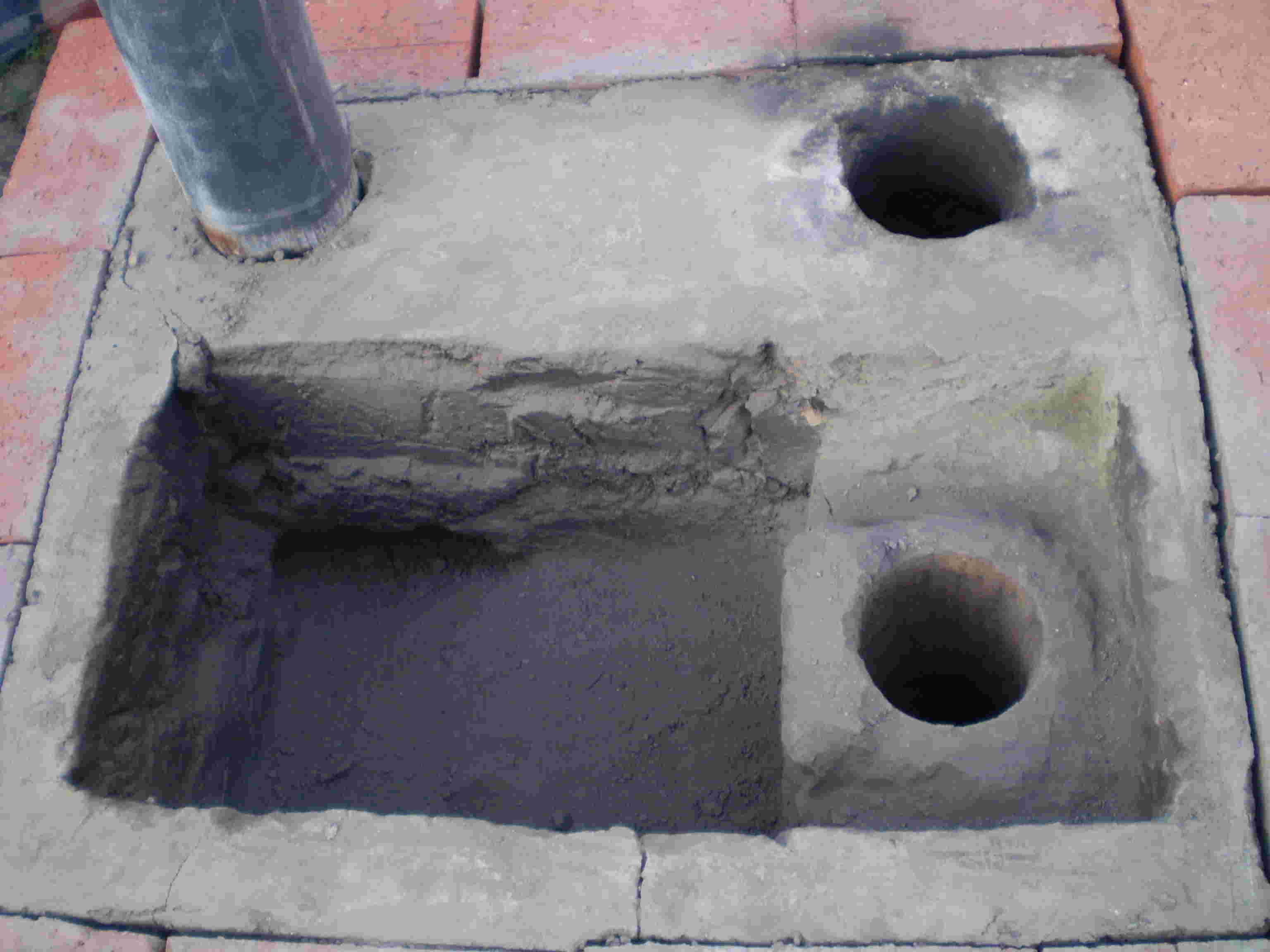 By digging downward at the other end I was able to make a channel to a third 3” hole, to which I connected the 3” flue pipe. In order to not dissolve everything by accidentally spilling something on it I solidified the structure by firing it. I did this by covering the rectangular hole with bricks to trap the heat, limited spare drafts by pouring on a little dirt, and built a fire.