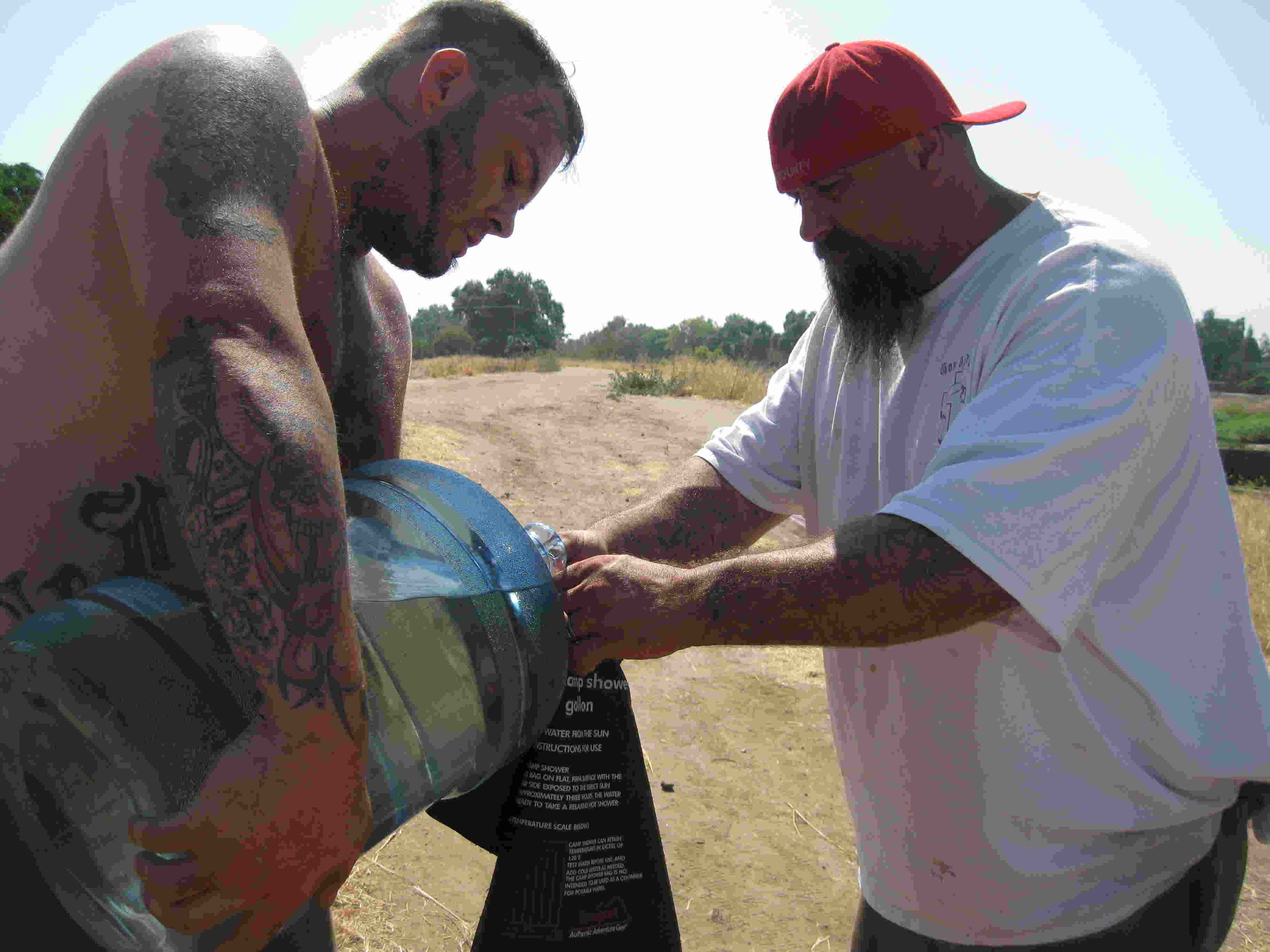 The water was heated in a couple of black-painted gallon milk jugs. They were resting on a